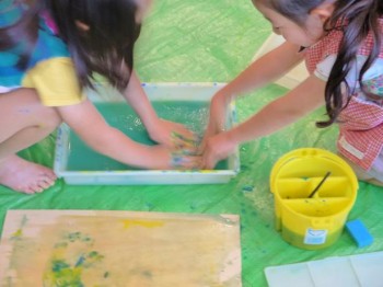 「わぁ!緑にかわった!」 と驚きの表情を見せる子どもたち 濡れた画用紙の上でフワッと 出会う色がなんとも綺麗でした
