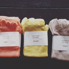 温かな色に草木染めしたシルクインナーシリーズです。 靴下、レギンス、はらまきをご用意いたしました。
